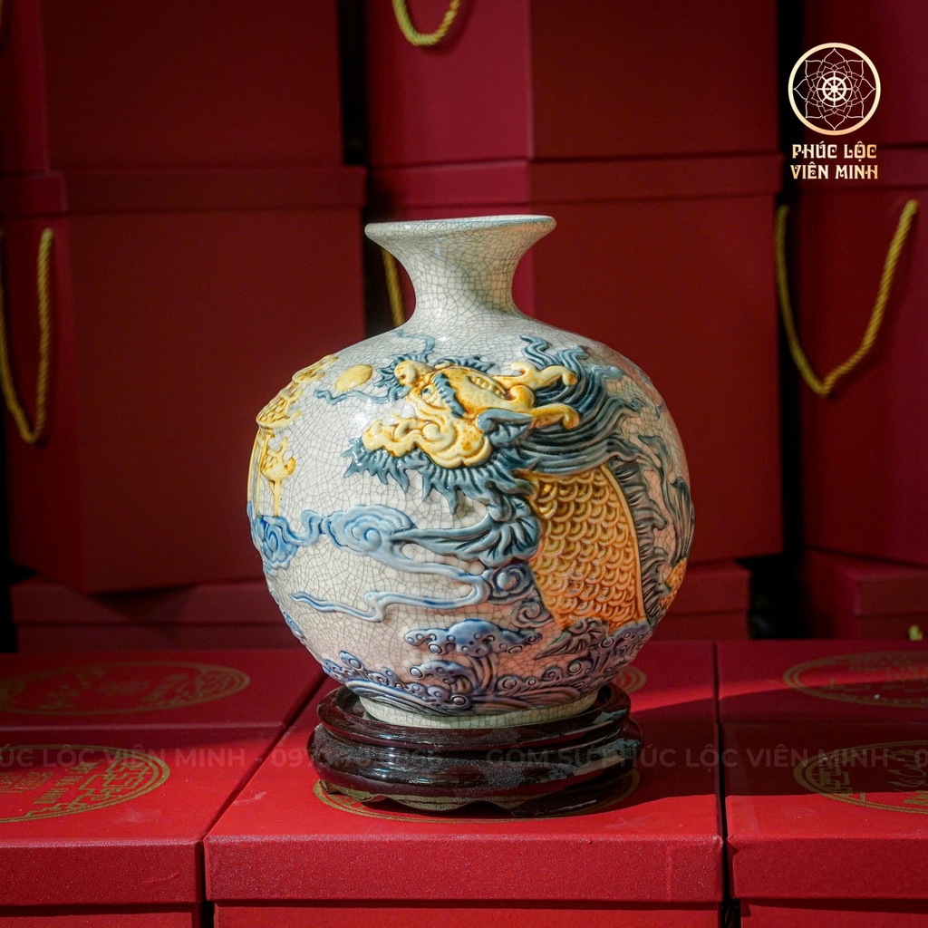 ✨ Đắp nổi thủ công tinh xảo: Bình được nghệ nhân chạm khắc và đắp nổi hình rồng – linh vật tối thượng trong văn hóa phương Đông. Các chi tiết vảy rồng, mây trời và sóng nước được tạo hình sắc nét, sống động, thể hiện tay nghề đỉnh cao của nghệ nhân Bát Tràng.