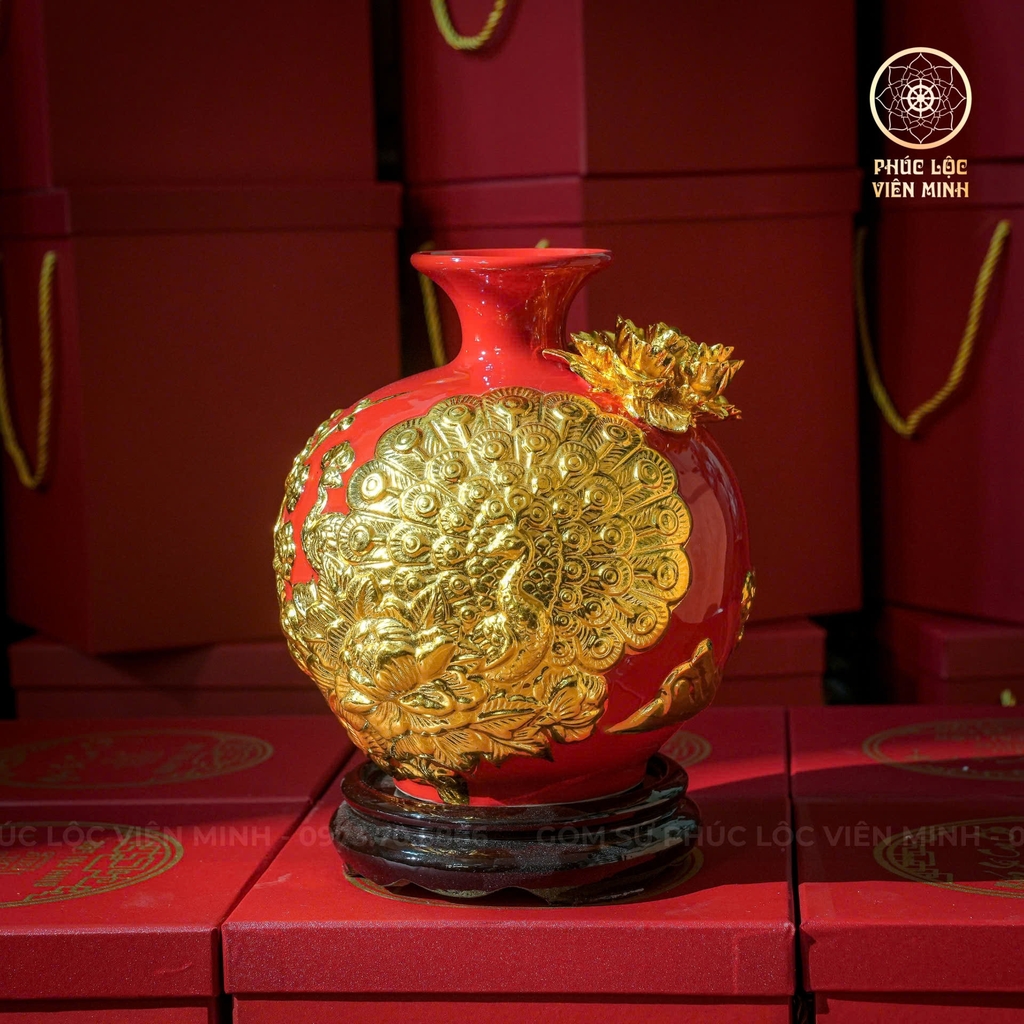 Bình Hút Lộc Men Đỏ Đắp Nổi Dát Vàng Gốm Sứ Bát Tràng - Phúc Lộc Viên Minh - BHL025