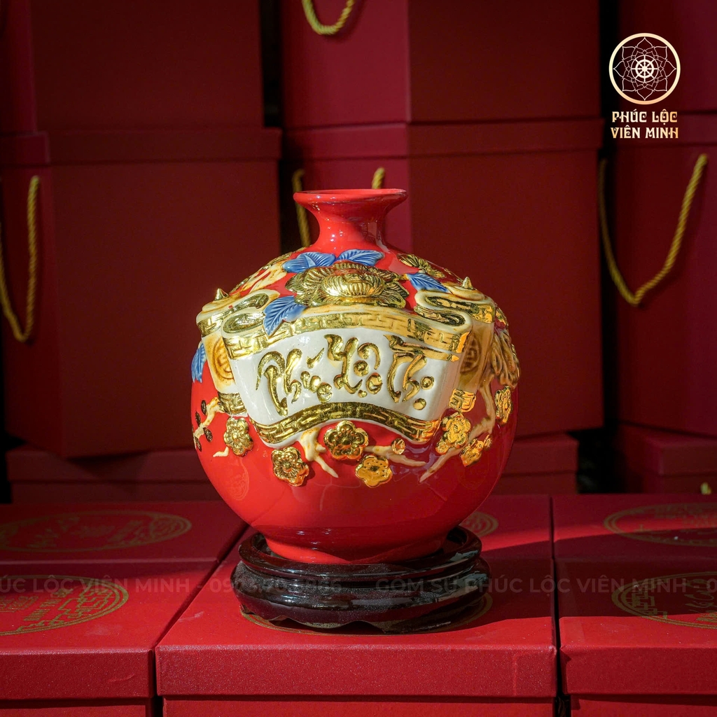 💎 Giá trị phong thủy: Màu đỏ rực rỡ biểu trưng cho may mắn, cát khánh, kết hợp ánh vàng sang quý mang đến năng lượng tích cực, giúp thu hút tài khí và duy trì sự hưng vượng. Bình thích hợp đặt tại phòng khách, văn phòng, sảnh đón tiếp hoặc phòng thờ để chiêu tài, giữ lộc và nâng cao vượng khí.