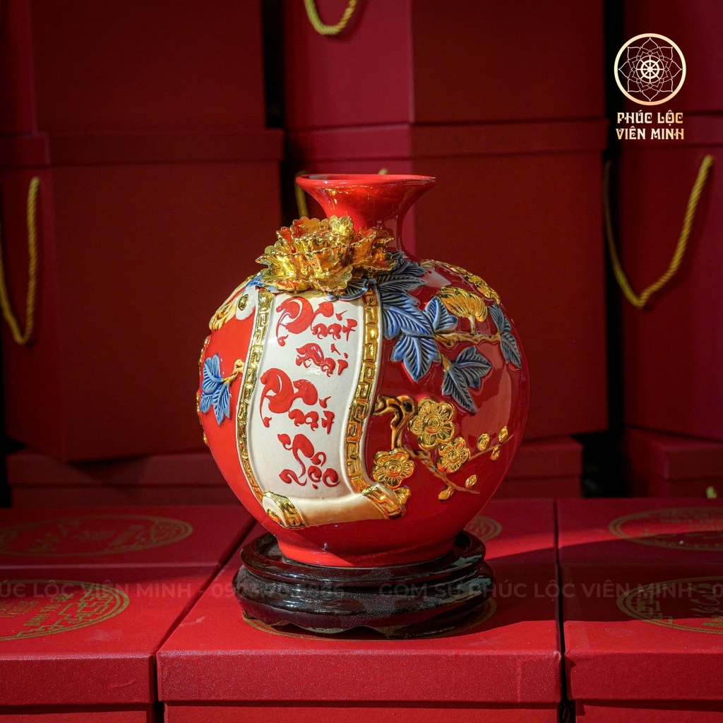 💎 Giá trị phong thủy: Màu đỏ rực rỡ đại diện cho may mắn và hỷ sự, kết hợp ánh vàng quyền quý tạo nên năng lượng cát tường mạnh mẽ. Bình thích hợp trưng bày ở phòng khách, phòng làm việc, không gian thờ cúng nhằm thu hút tài khí, nâng cao vượng khí và đem lại bình an.