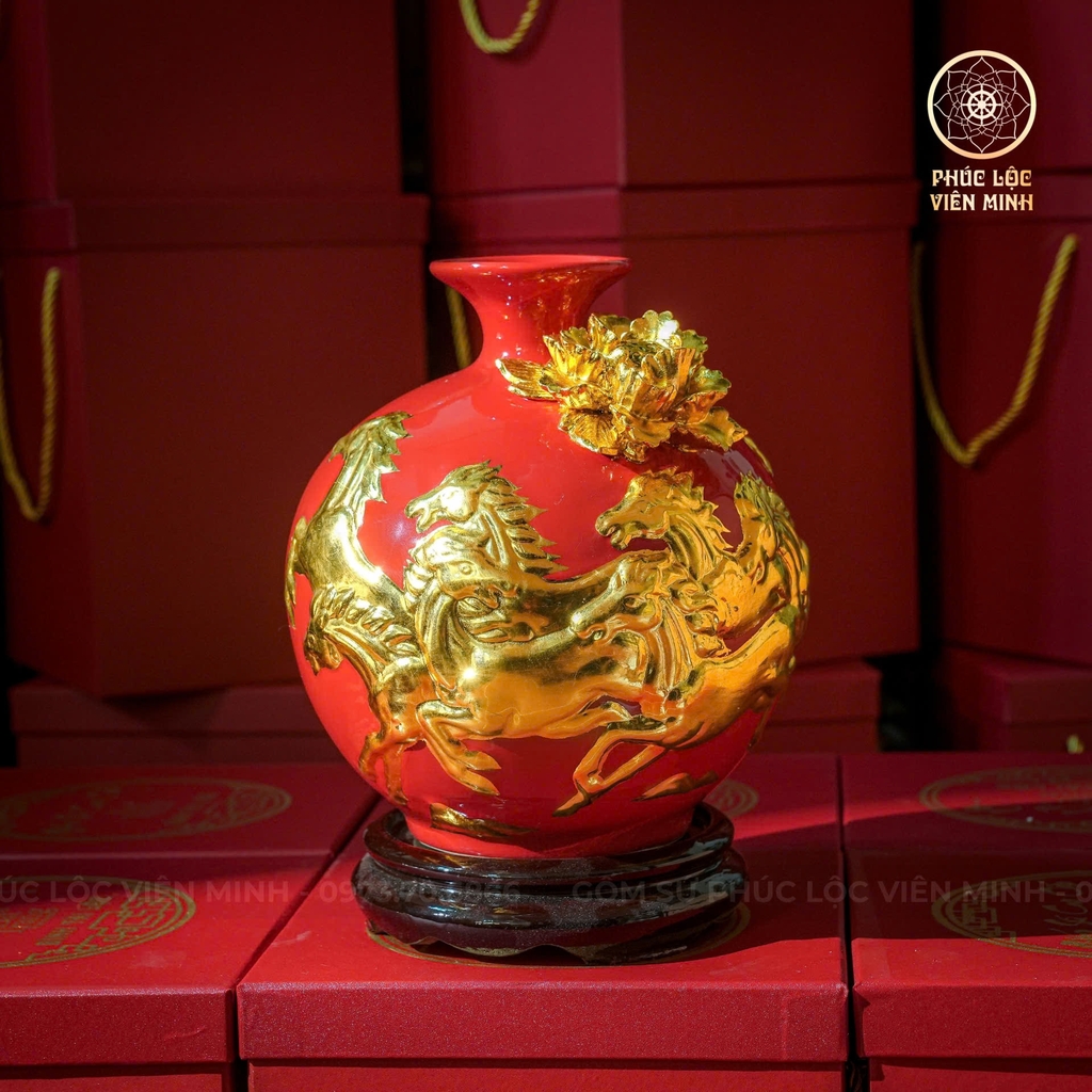✨ Họa tiết Mã Đáo Thành Công: Trên thân bình là hình ảnh đàn ngựa phi nước đại đắp nổi dát vàng tinh xảo, biểu trưng cho sự kiên cường, bứt phá và thăng tiến. Bát mã còn mang ý nghĩa tài lộc dồi dào, thành công viên mãn trở về cho gia chủ.
