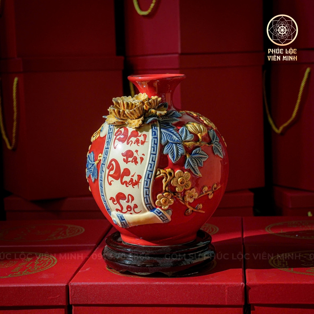 🔥 Tinh hoa gốm sứ Bát Tràng: Bình hút lộc men đỏ đắp nổi BHL011 mang gam đỏ cát tường – biểu tượng của may mắn, hỷ sự và thịnh vượng. Nổi bật trên thân bình là đại tự thư pháp “Phát Tài Phát Lộc”, kết hợp với hoa mai và cúc vàng, được nghệ nhân chế tác hoàn toàn thủ công, sắc nét và sang trọng.