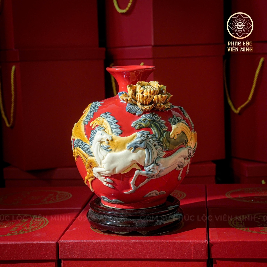 🔥 Tinh hoa gốm sứ Bát Tràng: Bình hút lộc men đỏ đắp nổi BHL012 nổi bật với gam đỏ cát tường, mang ý nghĩa may mắn, hanh thông. Điểm nhấn trên thân bình là họa tiết “Bát mã truy phong” – tám chú ngựa tung vó đầy uy lực, được nghệ nhân Bát Tràng khắc họa thủ công tinh xảo, sống động như thật.