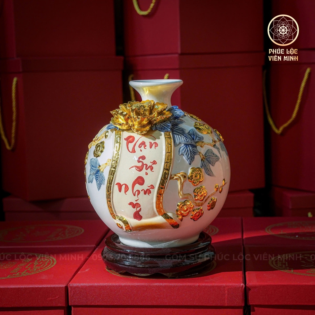 🔴 Chữ thư pháp "Vạn Sự Như Ý": Điểm nhấn của bình là dòng chữ thư pháp màu đỏ son nổi bật, mang ý nghĩa chúc phúc an lành, vạn điều may mắn, công việc thuận buồm xuôi gió. Đây là thông điệp cát tường mà gia chủ luôn mong cầu cho gia đình và sự nghiệp.