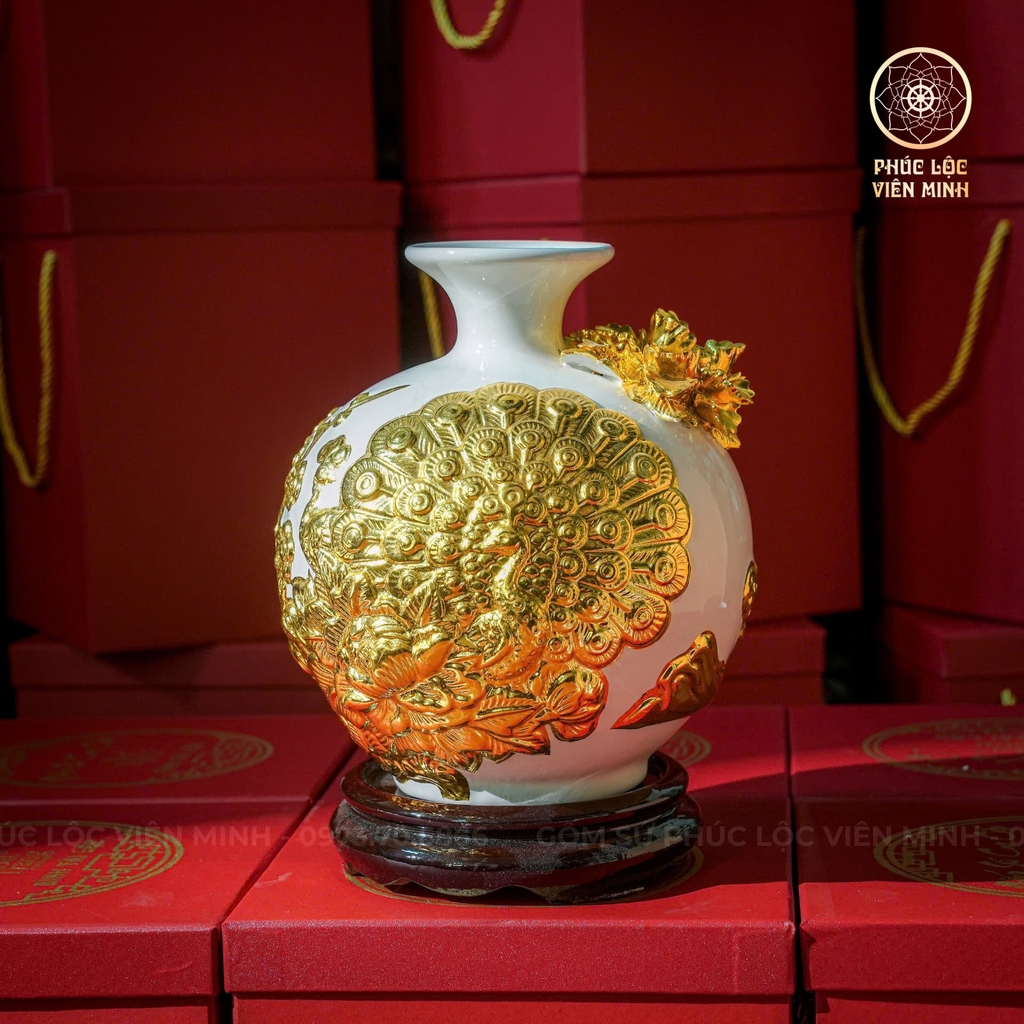 ✨ Tinh hoa gốm sứ Bát Tràng: Bình hút lộc men trắng dát vàng BHL029 được chế tác thủ công tỉ mỉ bởi nghệ nhân Bát Tràng. Lớp men trắng tinh khôi làm nền, tôn lên các họa tiết chim công – hoa mẫu đơn đắp nổi và dát vàng 24k lộng lẫy, mang lại vẻ đẹp thanh lịch, sang trọng nhưng không kém phần quyền quý.