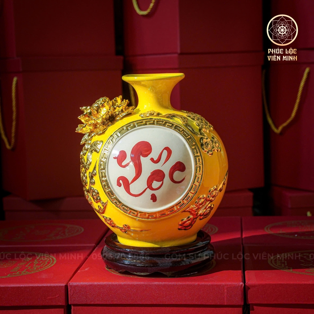 🖋 Chữ Lộc thư pháp: Điểm nhấn đặc biệt trên thân bình là chữ “Lộc” viết theo lối thư pháp mềm mại, uyển chuyển. Trong phong thủy, chữ Lộc tượng trưng cho tài lộc, phúc lành và sự thịnh vượng. Đây là lời chúc cầu mong gia chủ làm ăn phát đạt, của cải dồi dào, cuộc sống sung túc.