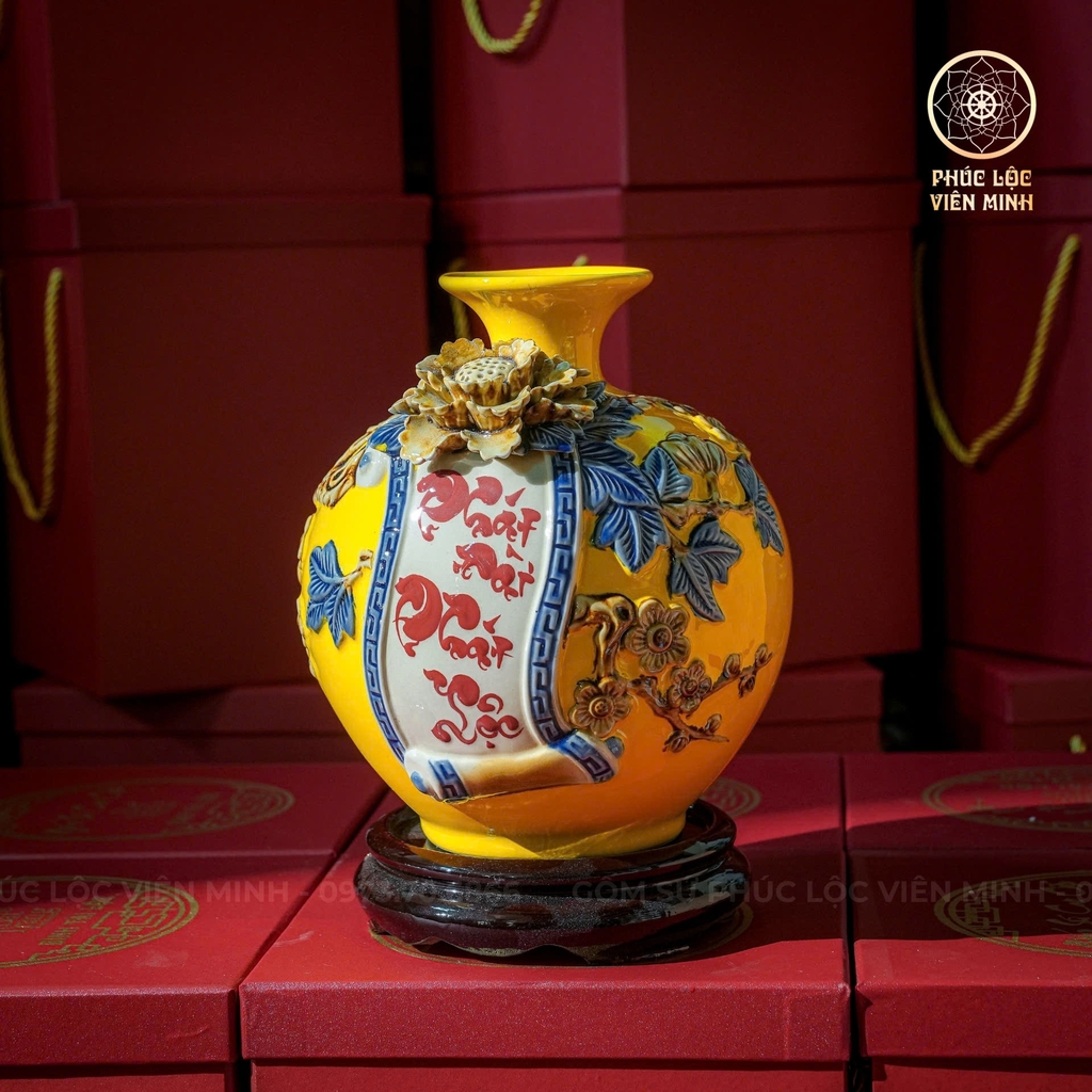 Bình Hút Lộc Men Vàng Đắp Nổi Gốm Sứ Bát Tràng - Phúc Lộc Viên Minh - BHL015