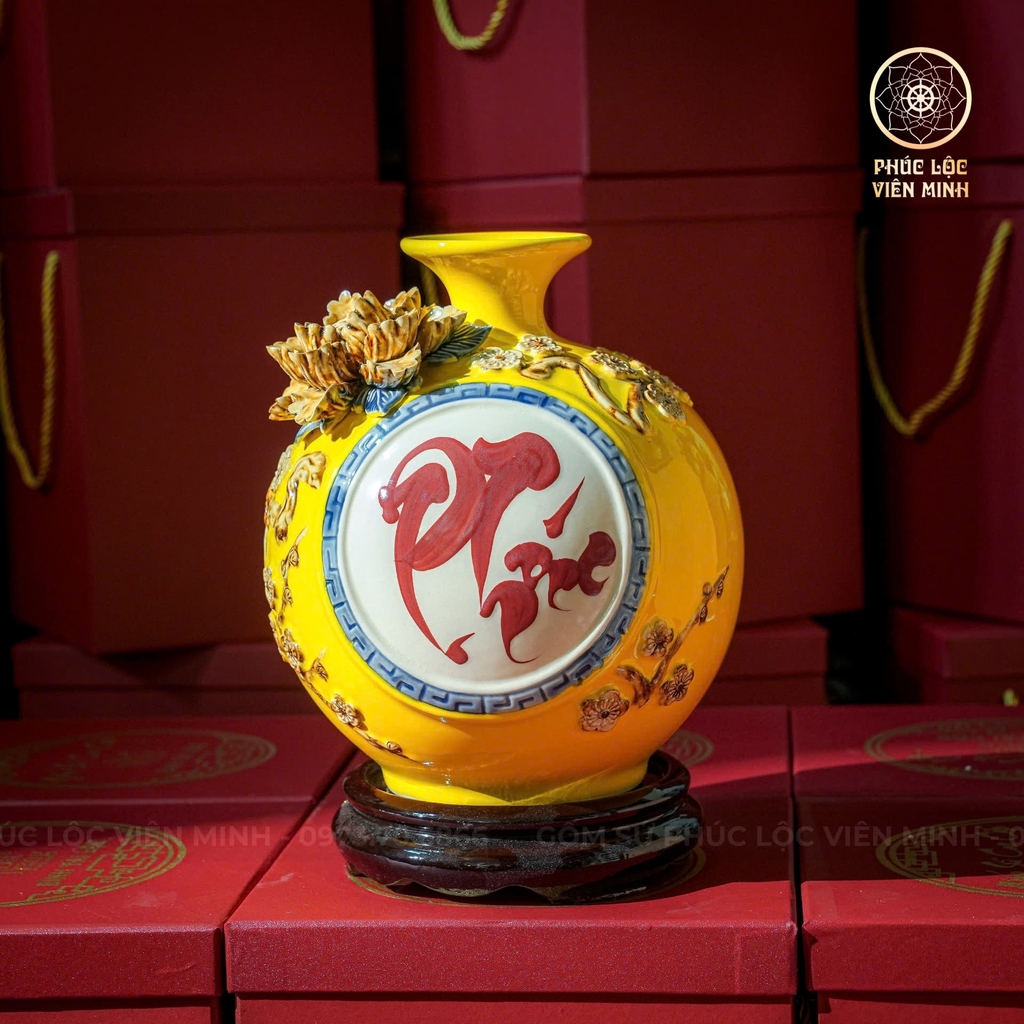 💎 Giá trị phong thủy: Dáng bình tròn đầy gợi sự sung túc, viên mãn. Khi kết hợp cùng sắc vàng cao quý và chữ Phúc linh thiêng, bình giúp chiêu tài – tụ lộc – giữ phúc khí, mang lại may mắn và sự an lành cho gia chủ. Đặc biệt phù hợp trưng bày tại phòng khách, phòng làm việc, phòng thờ để thu hút năng lượng cát lành và hanh thông công việc.