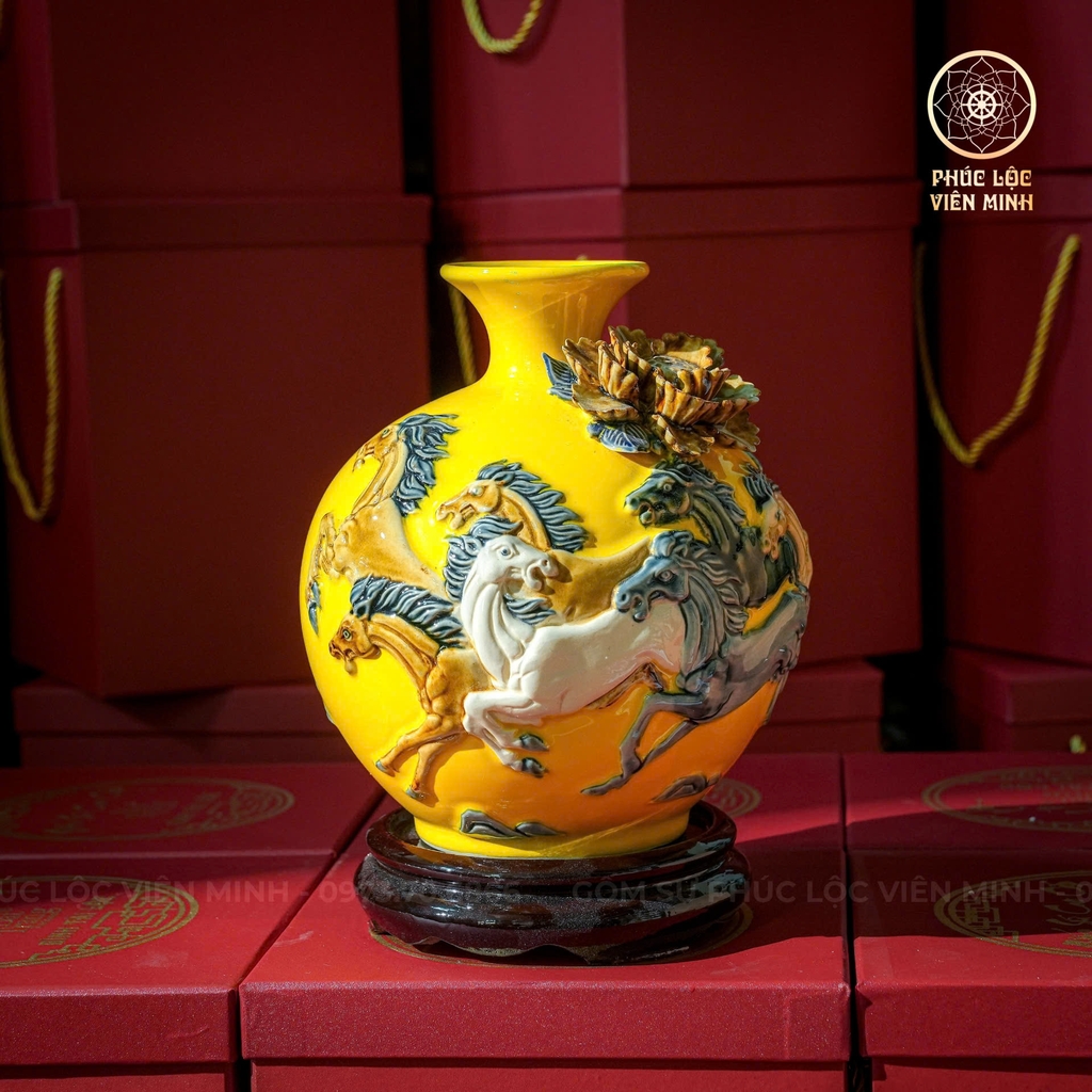 ✨ Tinh hoa gốm sứ Bát Tràng: Bình hút lộc men vàng đắp nổi BHL017 được chế tác thủ công tỉ mỉ bởi nghệ nhân Bát Tràng, phủ lớp men vàng rực rỡ – biểu trưng cho vinh hoa, phú quý và sự trường tồn. Trên thân bình, hình tượng Bát Mã Truy Phong được thể hiện sống động, từng chi tiết cơ bắp, bờm ngựa tung bay, tái hiện khí thế mạnh mẽ và đầy sinh khí.