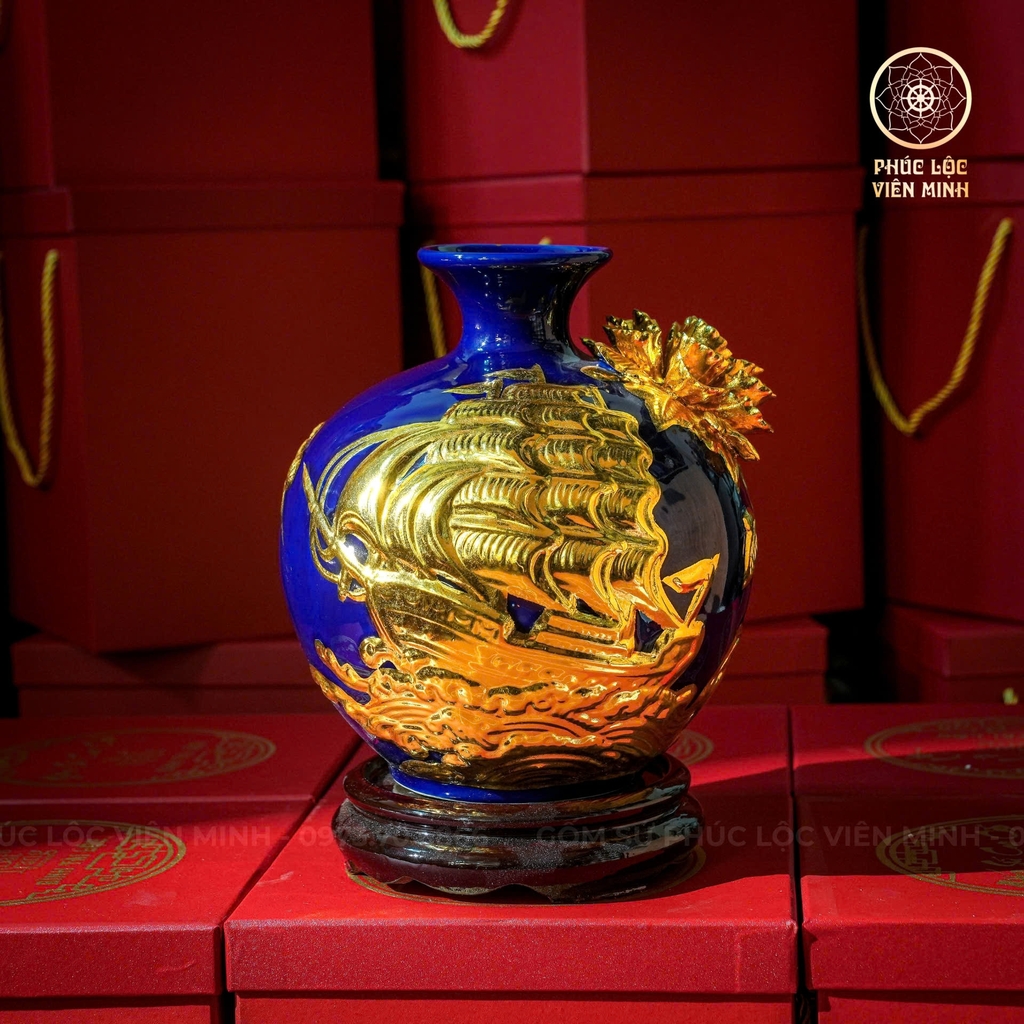 ⛵ Biểu tượng Thuyền Vàng đắp nổi: Trên thân bình, hình ảnh thuyền buồm no gió – biểu tượng của “Thuận buồm xuôi gió” – được nghệ nhân khắc họa tinh xảo, dát vàng sang trọng. Đây là biểu tượng phong thủy mạnh mẽ, giúp gia chủ hanh thông công việc, thuận lợi trong kinh doanh, tiền tài dồi dào.