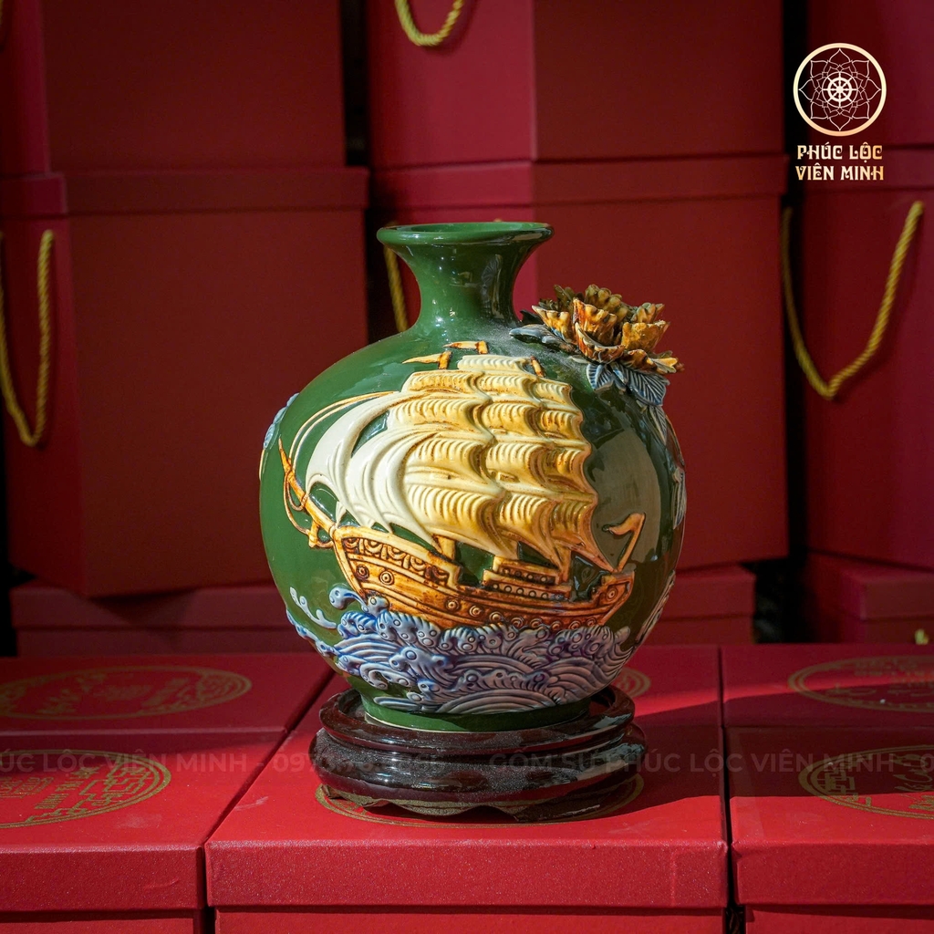 ✨ Đắp nổi thủ công tinh xảo: Bình được nghệ nhân khắc họa hình ảnh thuyền buồm căng gió vượt sóng trên nền men xanh ngọc. Họa tiết sóng nước uốn lượn, buồm lớn vươn cao và hoa sen đắp nổi tạo điểm nhấn, tất cả đều được tô vẽ sống động và hài hòa.
