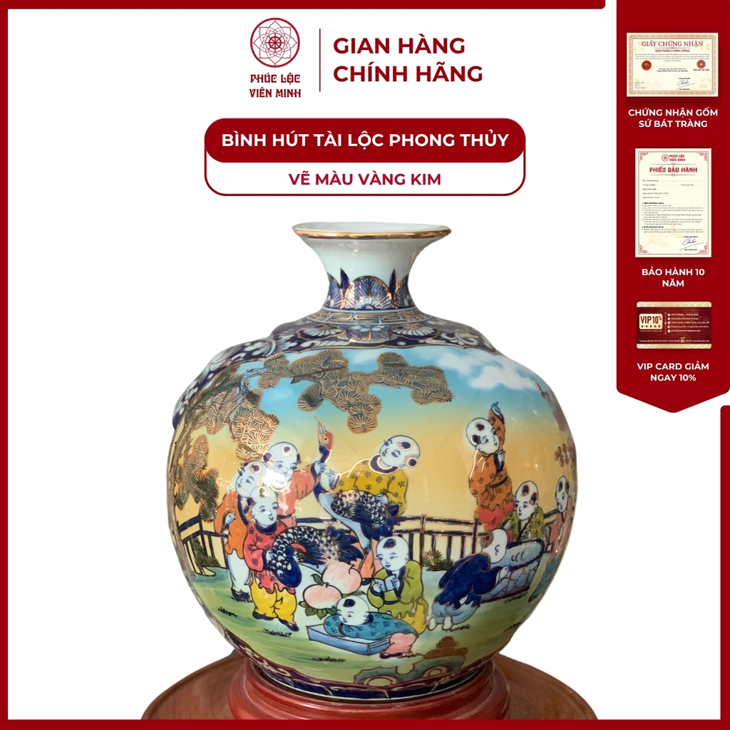 Bình Hút Lộc Nhị Cảnh Vẽ Màu Vàng Kim của Gốm Sứ Phúc Lộc Viên Minh là một sản phẩm đỉnh cao mang đậm nét truyền thống và sự tinh tế của Bát Tràng. Với thiết kế đặc biệt nhị cảnh, chiếc bình này không chỉ là một tác phẩm nghệ thuật mà còn biểu tượng của sự thịnh vượng và may mắn. Được trang trí với họa tiết vẽ màu vàng kim sang trọng, bình hút lộc này sẽ làm nổi bật không gian sống của bạn.