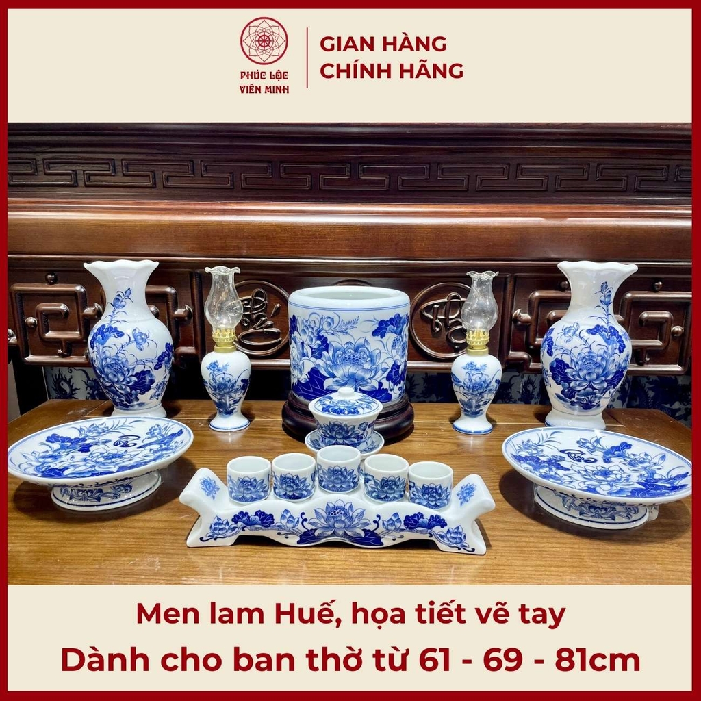 Bộ Đồ Thờ Men Lam Huế Họa Tiết Vẽ Tay Cao Cấp Gốm Sứ Bát Tràng - Phúc Lộc Viên Minh - PLVM500