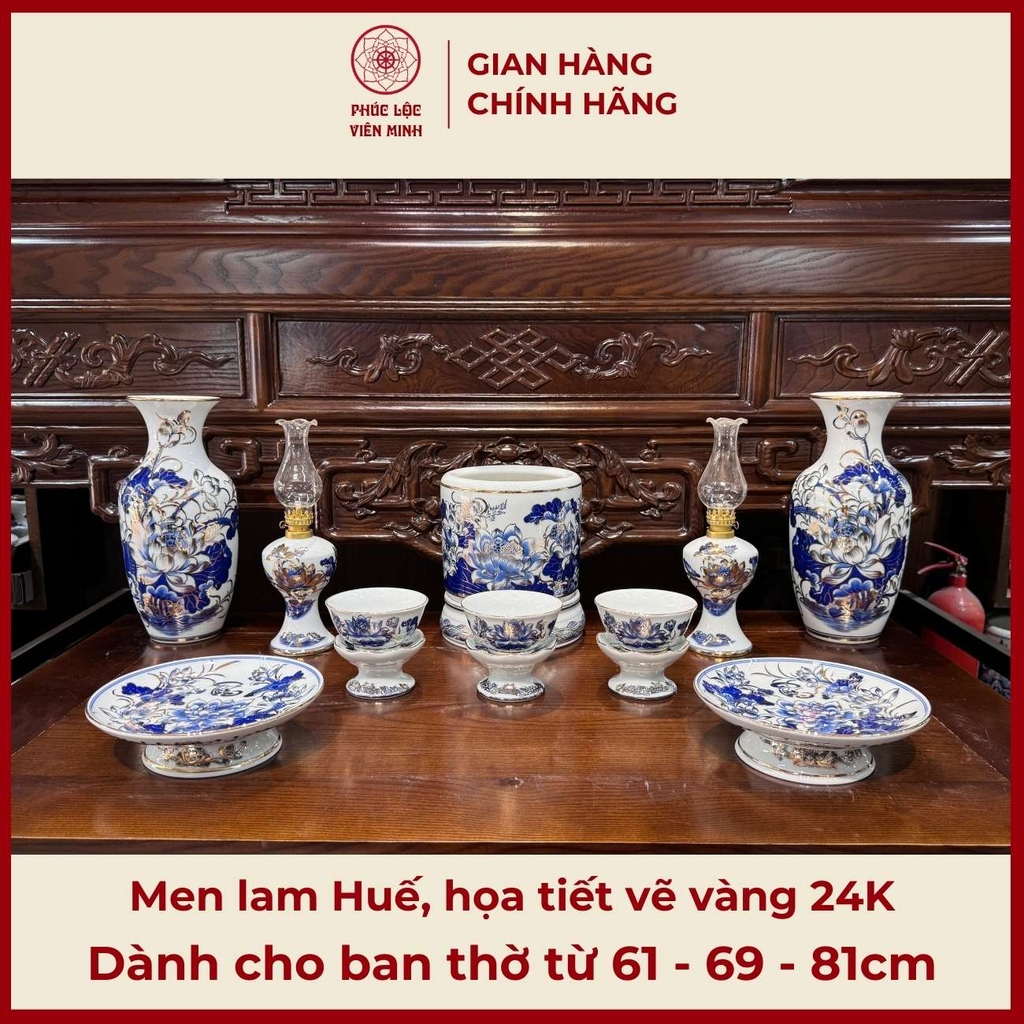 Bộ Đồ Thờ Men Lam Huế Họa Tiết Vẽ Vàng 24K Gốm Sứ Bát Tràng - Phúc Lộc Viên Minh - PLVM494