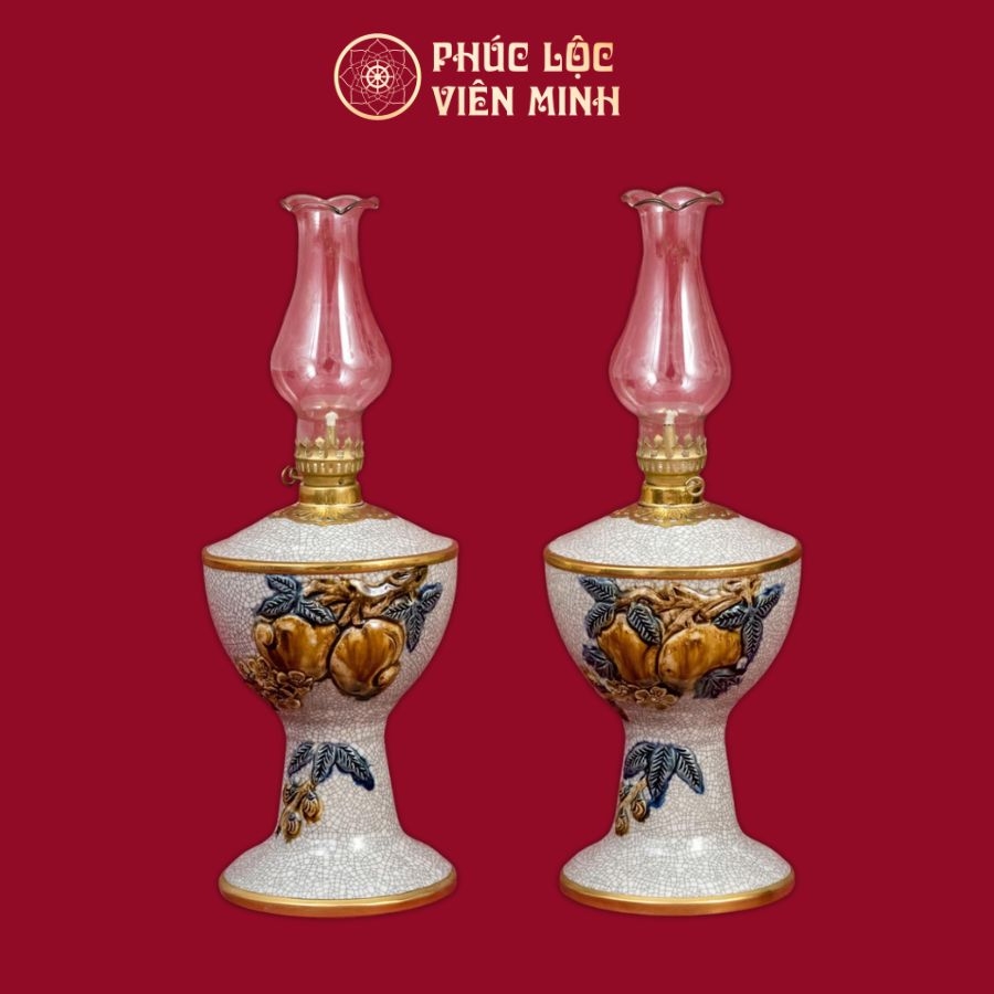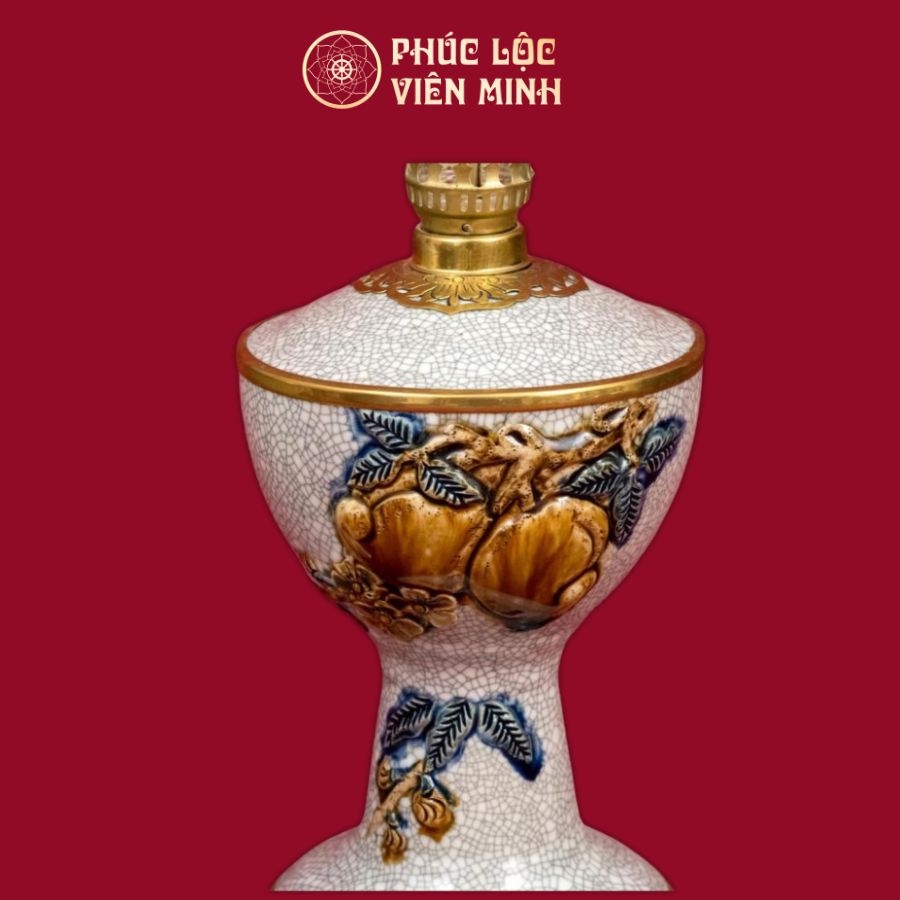 Đèn Thờ Váy Vuông Đào Men Rạn Đắp Nổi Gốm Sứ Bát Tràng - Phúc Lộc Viên Minh