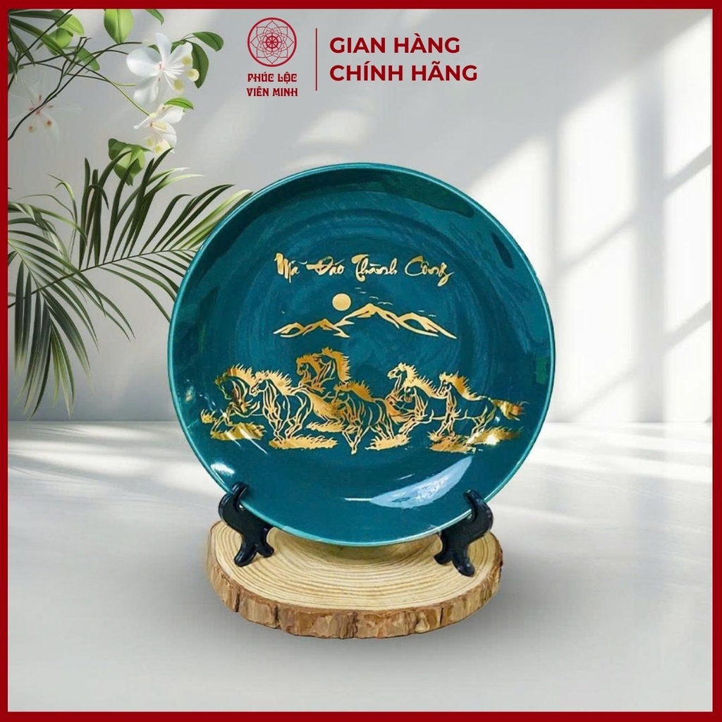 ✨ Đĩa Gốm Sứ Cao Cấp Gốm Sứ Bát Tràng – Phúc Lộc Viên Minh (LD075) được chế tác thủ công từ làng nghề Bát Tràng, mang sắc men xanh ngọc sang trọng, điểm nhấn bởi họa tiết dát vàng tinh xảo. Trên nền đĩa khắc họa hình tượng “Mã Đáo Thành Công” – biểu tượng cho sự thăng tiến, thành công và may mắn trong sự nghiệp, đồng thời mang ý nghĩa phong thủy chiêu tài, hút lộc.