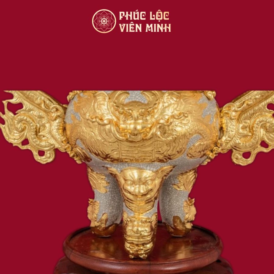 Đỉnh Hạc Chân Đồng Men Rạn Đắp Nổi Dát Vàng được chế tác từ chất liệu gốm sứ cao cấp của làng gốm Bát Tràng. Đất sét tinh khiết được nung ở nhiệt độ cao, đảm bảo độ bền và độ bóng hoàn hảo. Lớp men rạn cổ điển không chỉ đẹp mắt mà còn giúp sản phẩm chịu nhiệt và chống trầy xước tốt.